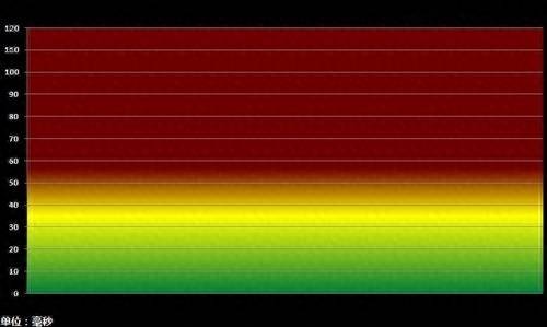 帧生成时间(Frame Time):顾名思义,帧生成时间指的就是渲染单独一帧所需的时间。也就是在翻页动画中翻一页所需的时间,所以生成帧的时间一般非常短,通常以毫秒为单位。那这和游戏流畅度又有什么关系呢?让我们先来做一点小小的计算:如某秒的帧数为30帧,那么已知每秒30帧是流畅游戏的最低标准,1s又等于1000ms,所以平均每帧的生成时间为1000/30=33ms。也就是说只要每帧的生成时间小于33ms,那么我们是难以察觉到游戏中的卡顿的。如果帧生成时间忽上忽下,就算平均下来的FPS为30以上,整个游戏流程下来也不会太流畅。如果你不是很理解这个概念,下面这个帧生成时间图能更好地帮助你更好地来理解这个概念(绿色代表流畅,红色代表不流畅)。