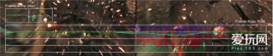 在这张图的左边中,从上到下我们可以依次清楚地看到当前帧率,帧生成时间表,和帧率变化表。