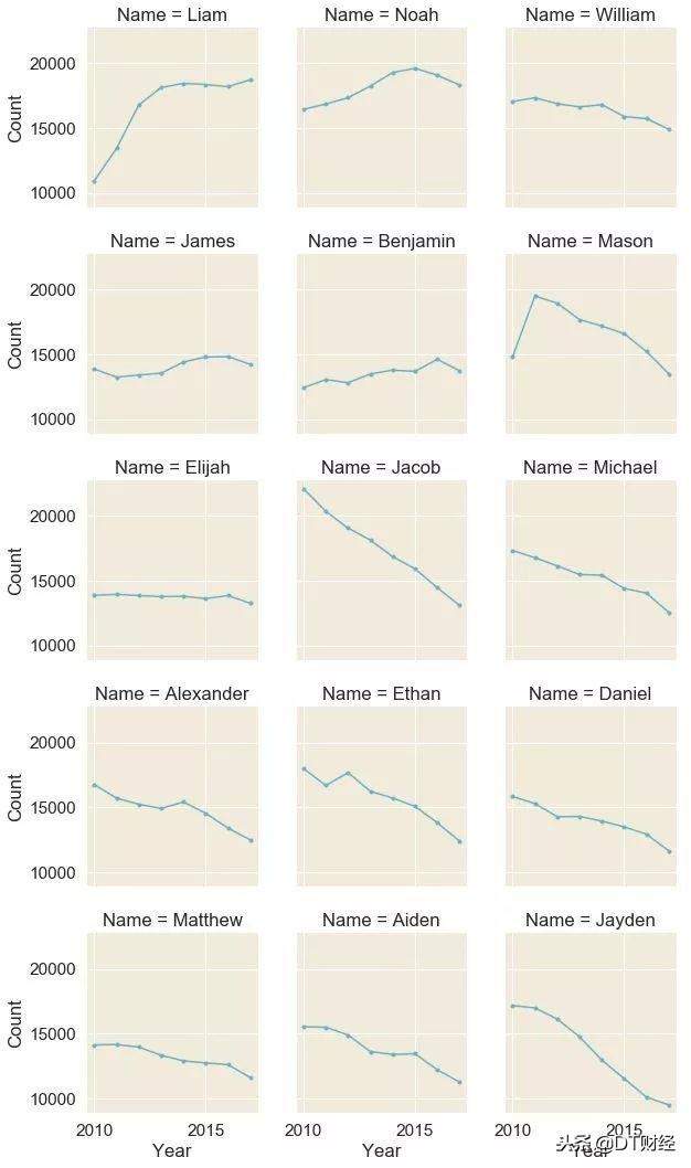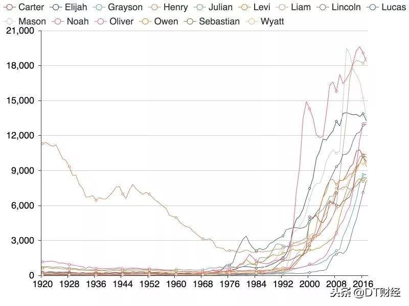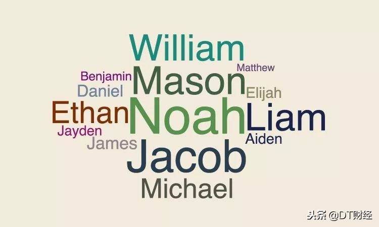Noah、Jacob、Mason、Liam、Ethan等等,是不是地道多了,瞬间就跟小伙伴们不一样了呢?数据显示,现在10后的小朋友里面,100个就有1个叫Noah的,再来看看这些名字的流行趋势。