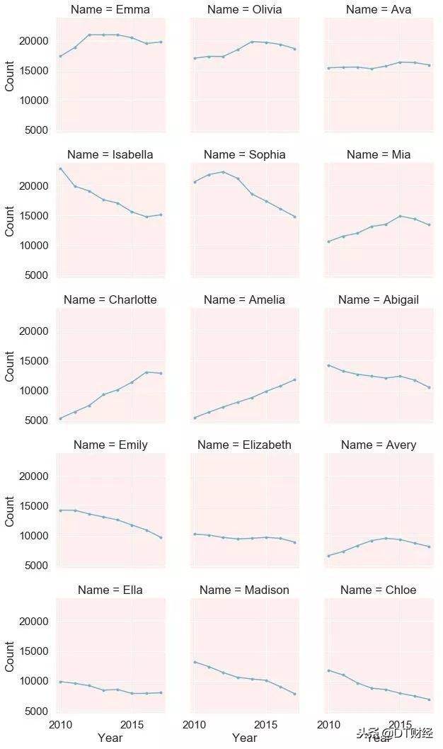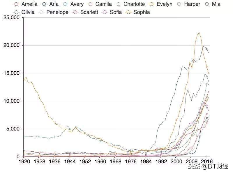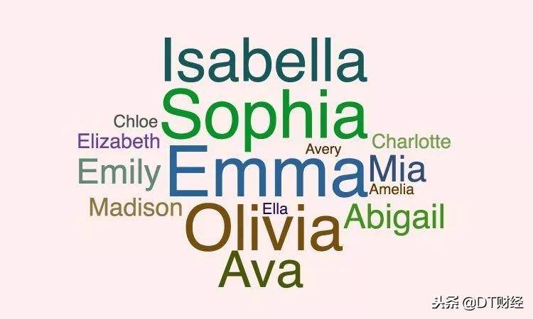 Emma、Sophia、Olivia、Isabella平分秋色,另外Emily(艾米莉)、Elizabeth(伊丽莎白)、Ella(艾拉)这几个相信大家都很熟悉了。Ava、Avery、Abigail、Amelia这几个名字倒是不常见。看看流行趋势: