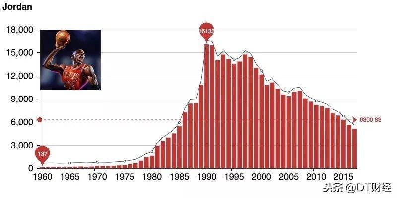 虽说Jordan是人家的姓,但这丝毫不影响这个名字的被接受程度。可以看到,Jordan的受欢迎程度跟乔丹的职业生涯欺负息息相关,在1990-1993年三连冠时期达到顶峰,94年退役的时候微幅下降,1996-1998年第二次三连冠时期又重回顶峰,之后慢慢下降。