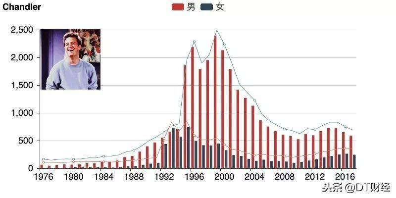 该名字整个凸出来的时期,正是《老友记》的黄金十年。但是可以看到,这个名字比较中性,女生也有叫Chandler的,大概占20%,于是有了《老友记》中“钱德勒是女生”的梗。