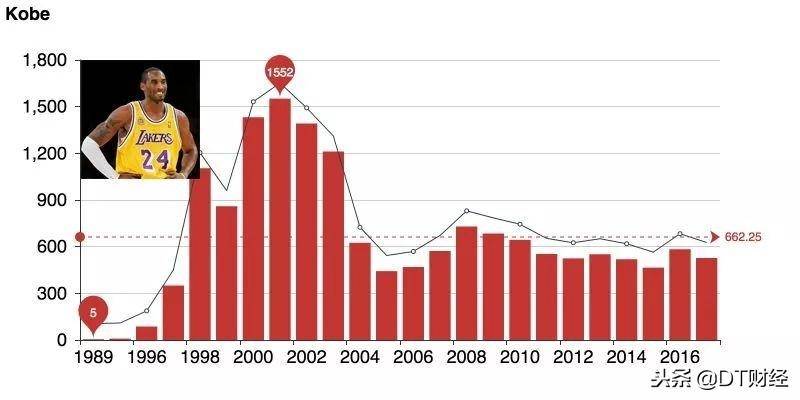 1989年之前,几乎就没有人叫Kobe,96年科比进入NBA之后,越来越多的小孩叫Kobe。在他2000-2002年三连冠时期,这个名字受欢迎程度达到了顶峰。以前喜欢打篮球的男生们,是不是也想要叫自己Kobe啊?