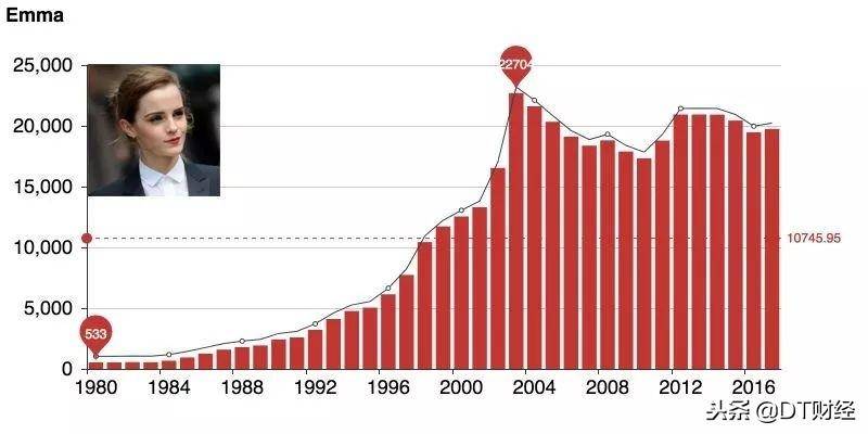 Emma这个名字,也是从艾玛·沃特森2000年出演《哈利波特》之后开始大火的,并且,作为《哈利波特》里唯一一位没有长残的童星,她凭借自己的能力和美貌,使自己越来越火,导致这个名字直到现在还是占据着最受欢迎的位置。