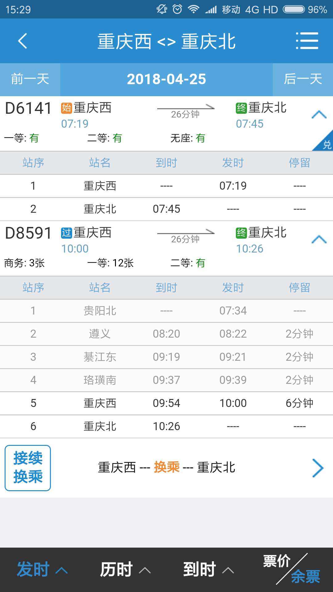 每天有两趟列车同时经过重庆西站和重庆北站,二十多公里的路程只要26分钟,二等座票价15元,一等座票价25元,是不是很方便呢。D6141次列车是为西站和北站特意开通的一列专车,全程只有这一个站。除了方便换乘的乘客,对于早高峰时的上班族也是很方便。D8591次列车是直接从贵阳始发站发过来的列车,全程票价129元,历时3小时左右,贵州的乘客就能到达重庆北站。