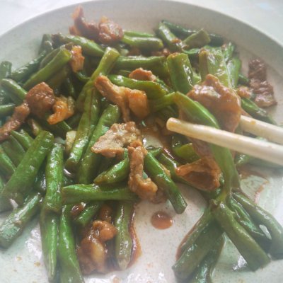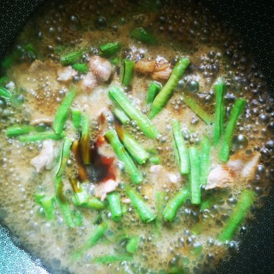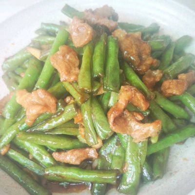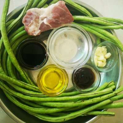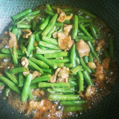 豆角 300g 前腿肉梅花肉 80g 蒜末 2瓣 食用油 20g 耗油 15g 酱油 20g 清水 200ml