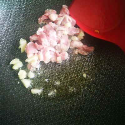3、洗锅热锅后加入蒜末,前腿肉翻炒两下
