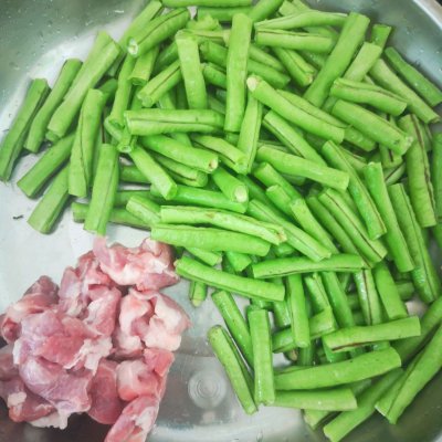 2、前腿肉切成自己喜欢小肉块或长肉条,豇豆角去掉头跟尾部,掰成长短均匀的条状