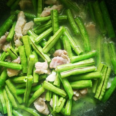 4、加入豇豆角去翻炒两下加入适量清水,全程大火烧开哦