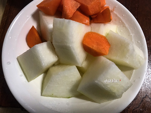 第三步,取半根胡萝卜切成滚刀块,冬瓜去皮切块备用。