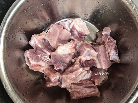 第一步,把排骨清洗干净了,用淘米水清洗排骨,不要直接用水龙头冲洗,避免脏东西四处飞溅,洗干净后沥干水分备用。