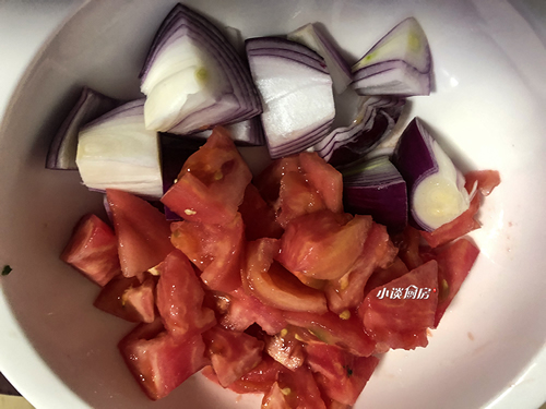 第二步,番茄用火烫一下,然后剥去皮,再切成小块备用。再切点洋葱备用。