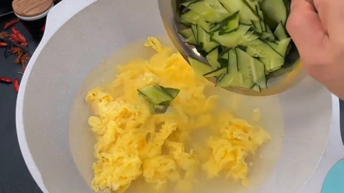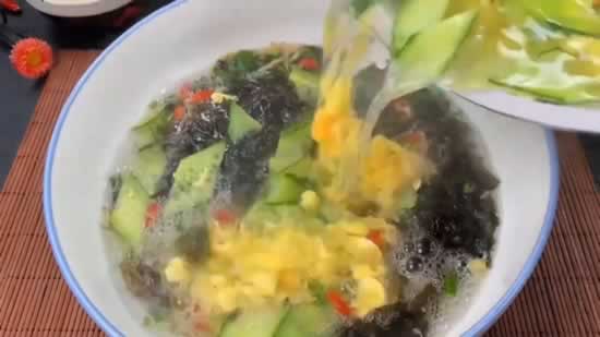 紧接着我们开始拿起勺子,往前推动一下,让鸡蛋能更加受热均匀,,等到鸡蛋液全部定型以后,就把黄瓜片倒进去,用勺子来回推动几下,随后将紫菜、虾米、葱花,盐、鸡精依次倒入大碗中,最后将鸡蛋和黄瓜片直接倒下,最后淋入几滴香油增香,搅拌均匀就可以喝了。