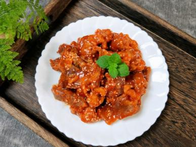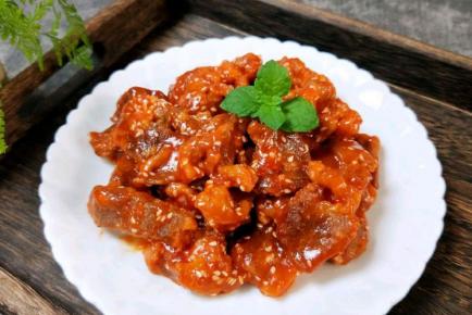 炒锅加入适量新鲜的植物油,油热后把调好的酱料放进去,不停用炒勺翻炒,等汤汁浓稠冒泡时,把热好的酥肉放进去翻炒,让汤汁裹满酥肉,最后再撒入少许白芝麻,翻炒均匀即可出锅。
