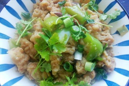 3分钟后,加入尖椒和葱片,开大火收一下汤汁,汤汁不要收得太干了,留上一点点最好。汤汁收好后即可出锅装盘,最后撒入香菜段即可。