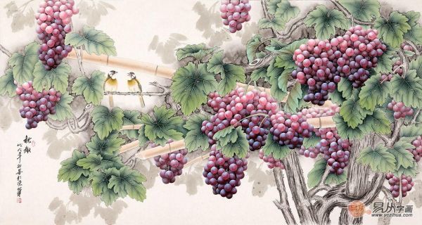 葡萄具有“紫气东来”、“多子多福”、“一本万利”的吉祥寓意,是最受欢迎的花鸟画题材之一,这幅葡萄图构图巧妙,虚实疏密相间。葡萄藤上挂满硕果,寓意多子多福,藤上有两只小鸟相互依偎,代表夫妻恩爱携手共此生,画中意境恬淡温馨,也饱含祝福之意。