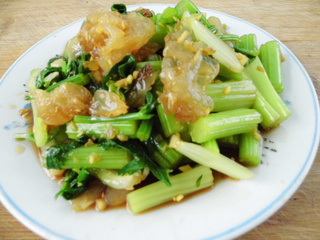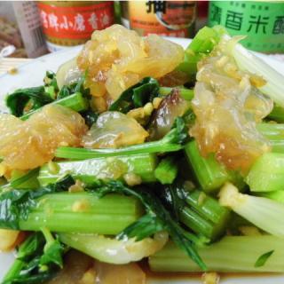 海蜇味甘、咸、性平。归肺、肝、肾经;具有清热化痰、消积化湿、润肠通便、阴虚肺燥、降脂降压之功效。 芹菜味甘、苦、性凉、无毒,归肺、胃、肝经。有平肝清热,祛风利湿,除烦消肿,凉血止血,解毒宣肺,健胃利血、清肠利便、润肺止咳、降低血压、健脑镇静之功能。特别适合高血压、动脉硬化、高血糖病人食用。