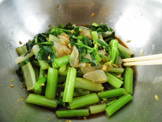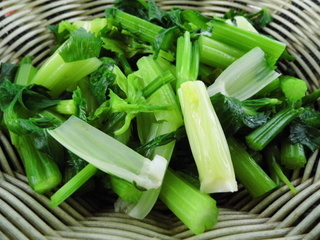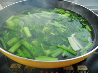 3. 3、开锅放入芹菜茎、叶淖一下。