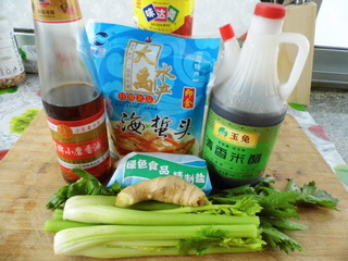 1. 食材:即食海蜇头、芹菜、姜、味达美酱油、香油、米醋、食盐。