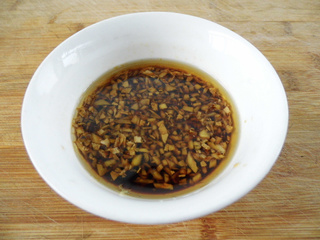 7. 姜切末放入碗里、倒入味达美酱油、米醋、香油、食盐拌匀备用。