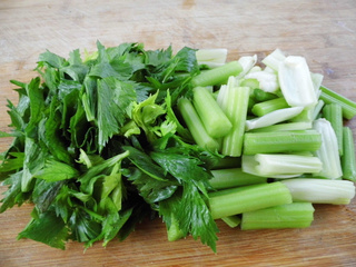 2. 芹菜择洗干净、芹菜茎切三公分长的段、芹菜叶一切二。