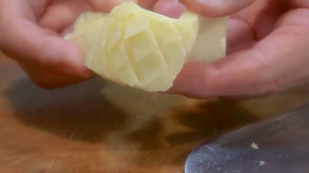 1.先来处理黄喉,因为牛黄喉比较厚一点,所以我会改个十字花刀,这样切出来不仅好看,更重要的是入味。