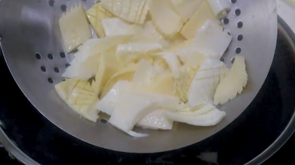 6.虽然是发制黄喉,还是要焯一下水。锅中水烧开后加点料酒进去,然后倒入黄喉,焯水30 秒捞出控水。这个不是鲜黄喉,所以不用焯太久。