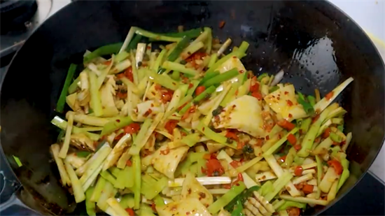 9.下入韭黄、仔姜和小葱节快速炒匀。炒匀后淋入料汁快速翻炒12秒,淋入藤椒油增香,关火炒匀起锅。