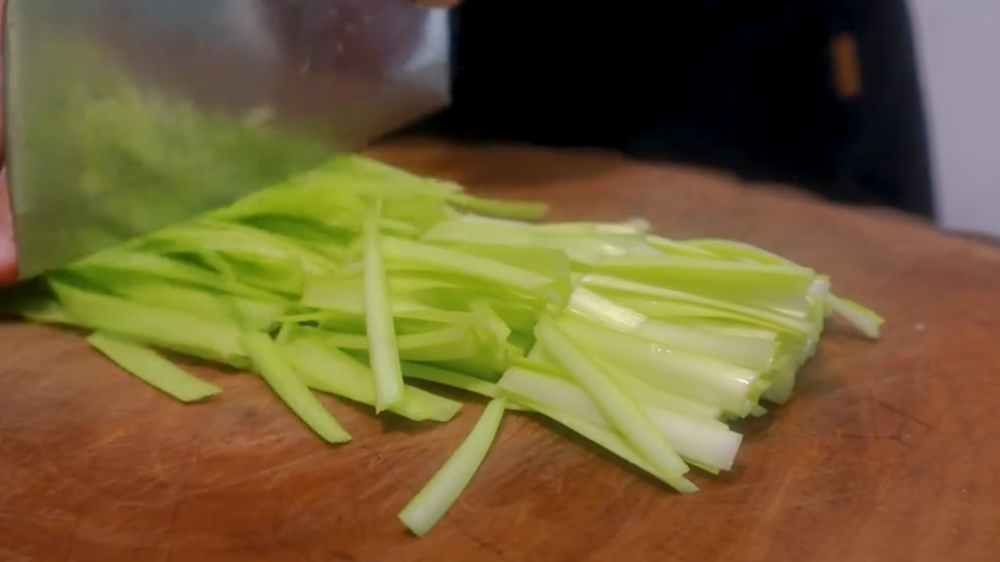 2.准备配菜和料头。炒黄猴用韭黄或者韭菜都非常的搭。先切点韭黄段,再准备几根小葱也切成段,配色的同时也能增加一种葱香味。