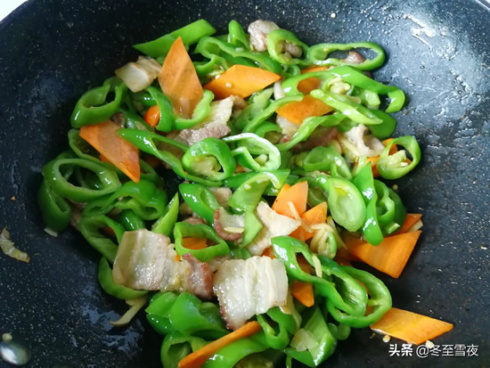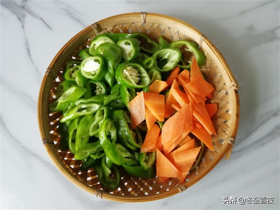 尖椒斜刀切成辣椒圈,胡萝卜切菱形片,五花肉切片。