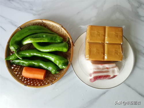 材料:香干3片、尖椒250克、五花肉150克、胡萝卜1段、油盐适量、葱1段、姜1片、大蒜2瓣、料酒半汤匙、生抽酱油2汤匙、