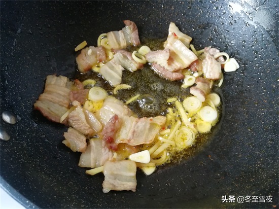 锅加油烧热,下入五花肉片煎炒,将五花肉煎炒出油,下入葱花、姜末、蒜片炒香