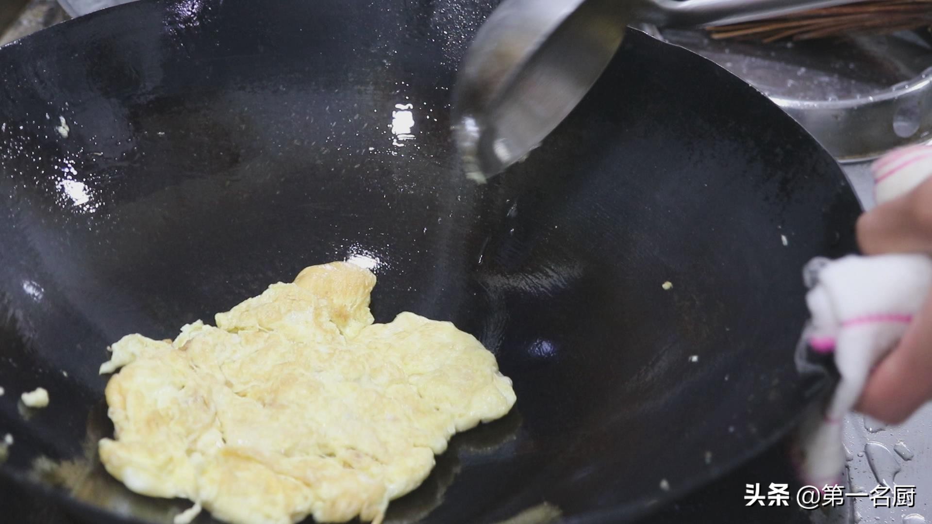 炒锅烧热,添入半勺食用油,油温烧至五成热时,倒入鸡蛋液,快速翻炒片刻,炒至鸡蛋定型以后,倒出控油备用。