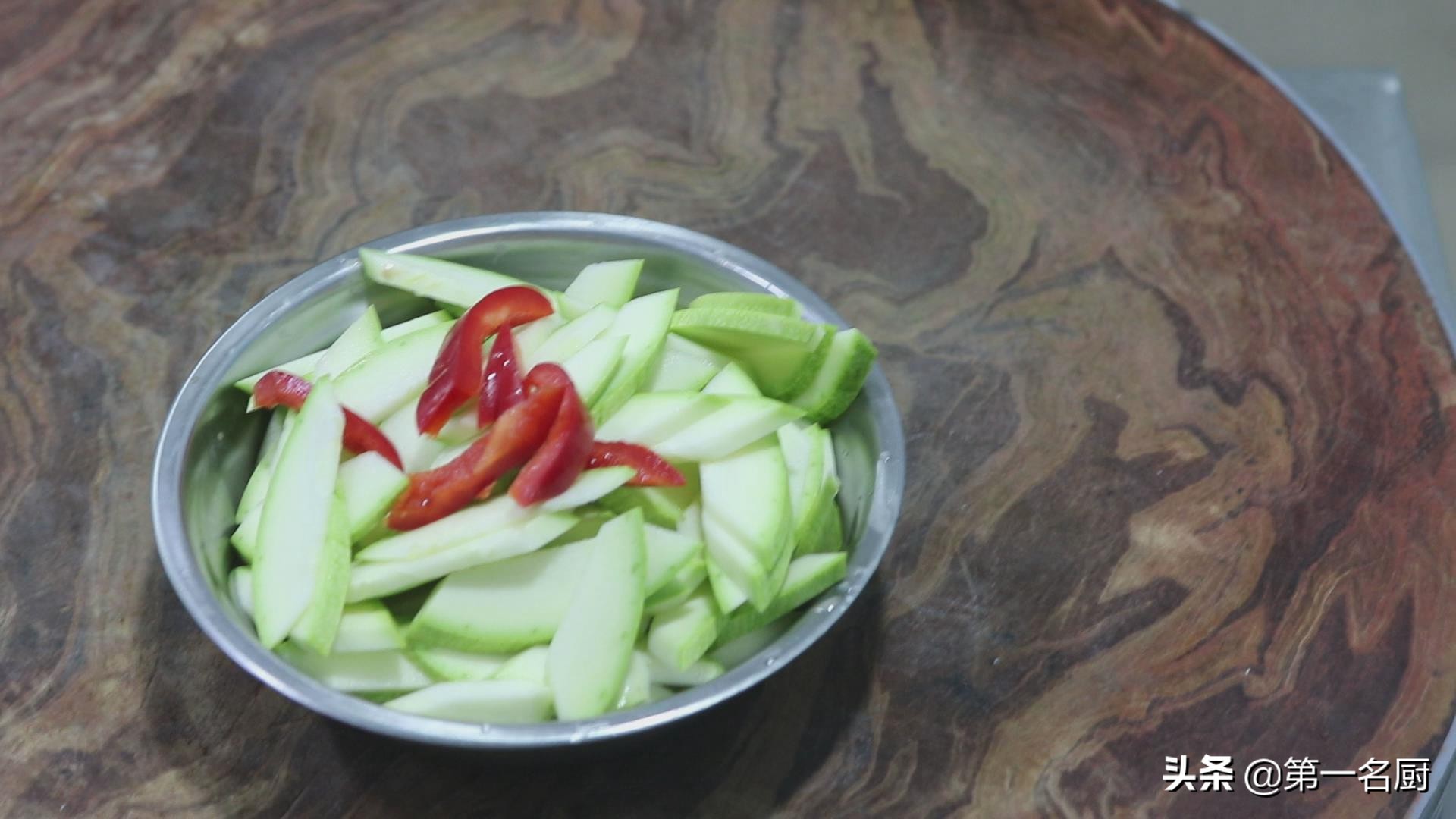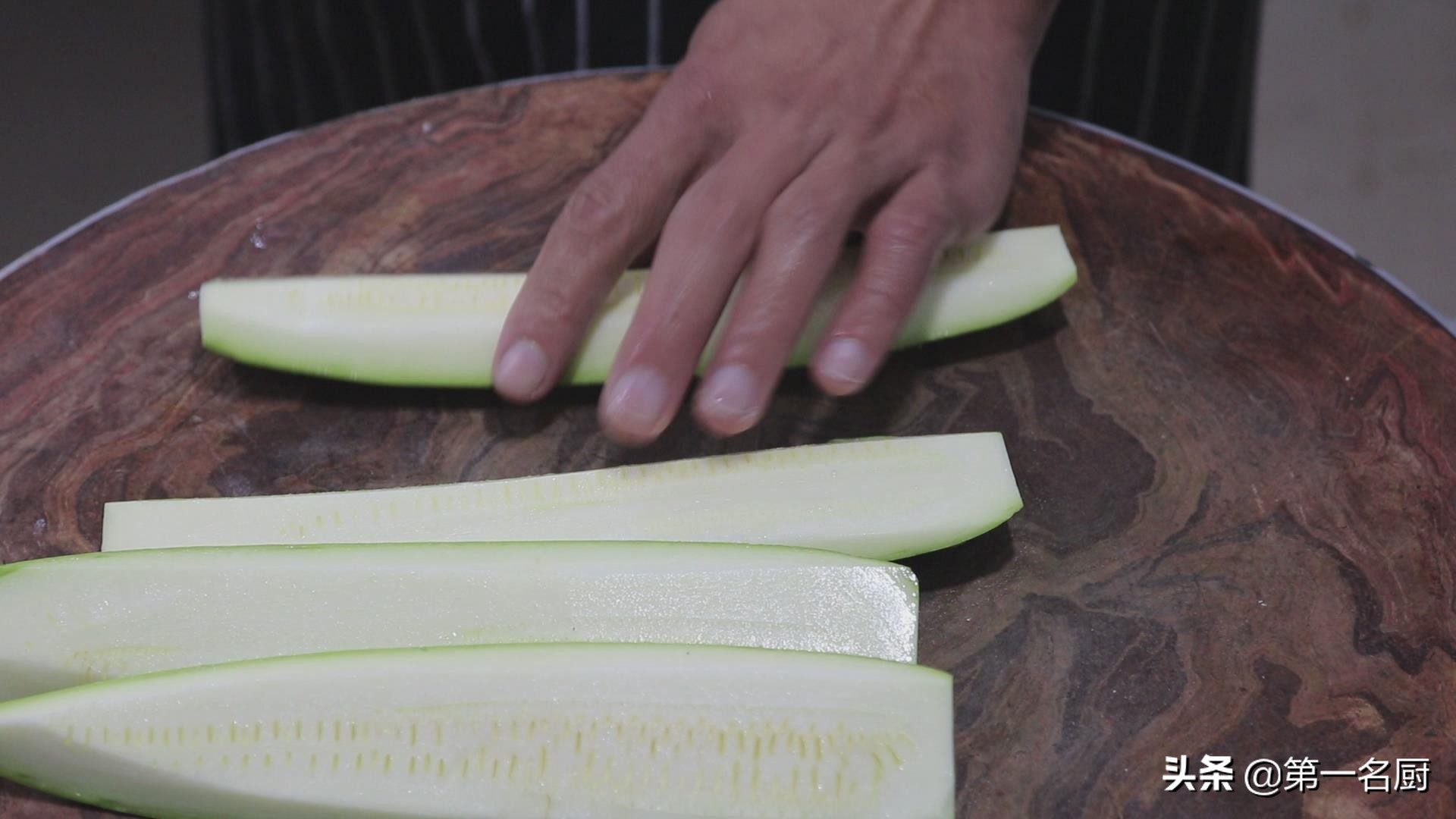 准备西葫芦一个,先去掉头尾,从中间切开,再一分四半,去掉内瓤,然后切成薄片,放入盆中备用。