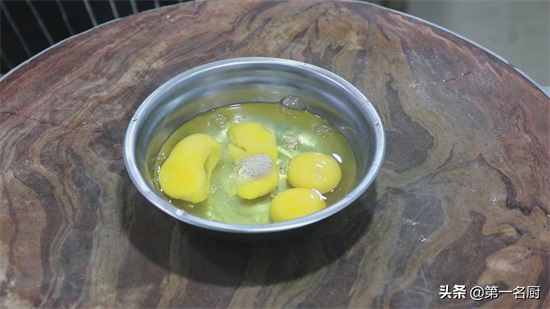 准备一个小盆,打入四个鸡蛋,加入食盐2克,鸡粉1克,胡椒粉0.5克,用筷子搅匀打散。