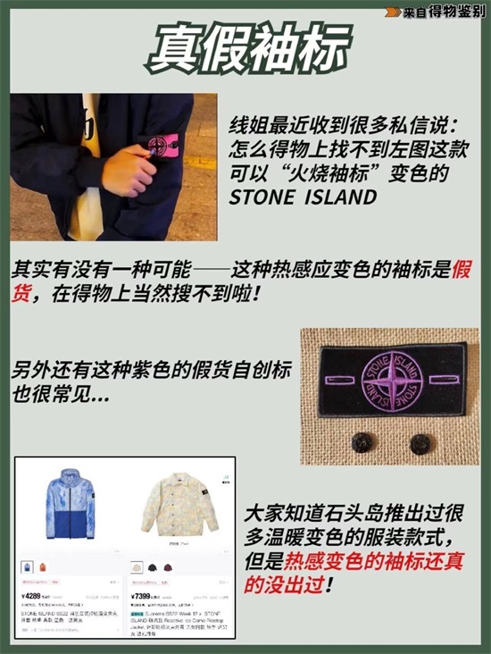 线姐最近收到很多私信说:怎么得物上找不到某音很火的可以“火烧袖标”变色的STONEISLAND…小伙伴们有没有想过一种可能一这种热感应变色的袖标是假的呢