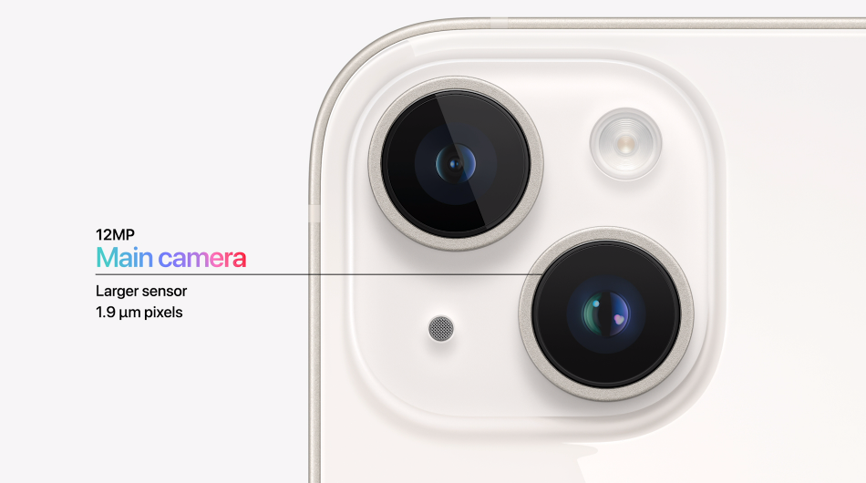 iPhone 14 和 iPhone 14 Plus 的影像配置是一样的,均搭载具备更大感光元件和像素尺寸的 1200 万像素主摄(?/1.5 光圈)、全新 1200 万像素前置原深感摄像头,以及 1200 万像素超广角摄像头(?/2.4 光圈和 120° 视角)。