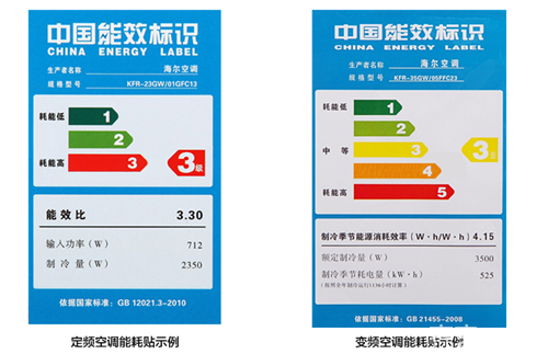 变频空调与定速空调的能效级别标准不一样。据介绍,能效比实际就是等于制冷量除以耗电量,定速空调的能效比共分为5个等级,从1~5级分别为3.4、3.2、3.0、2.8、2.6,变频空调的能效比也分5级,分别为5.2、4.5、3.9、3.4、3.0,其中变频空调的能效5级相当于定速空调的3级。