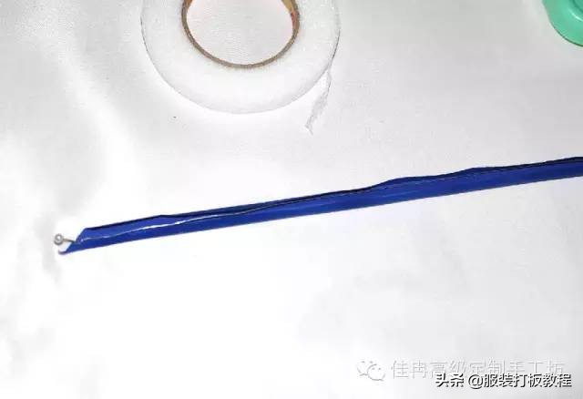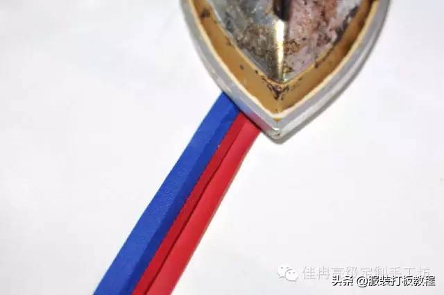 15.选取跟牙子一样长度的双面衬,用珠针固定一头,与牙子中心点重合,埋入牙子里面,烫牙子的时候要注意不要露胶,而且要保证铜丝在中心线处。如果在中心线处对牙子的塑形有决定性作用。