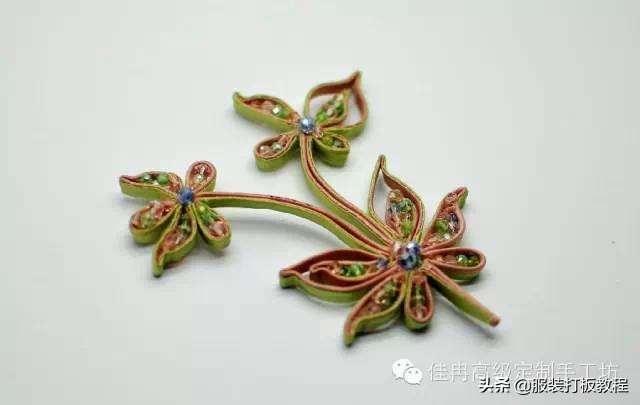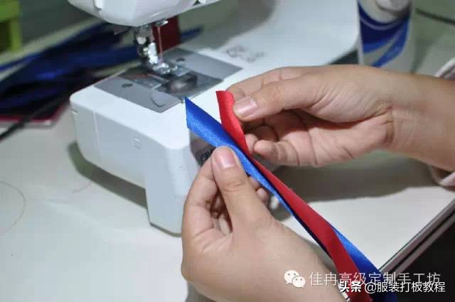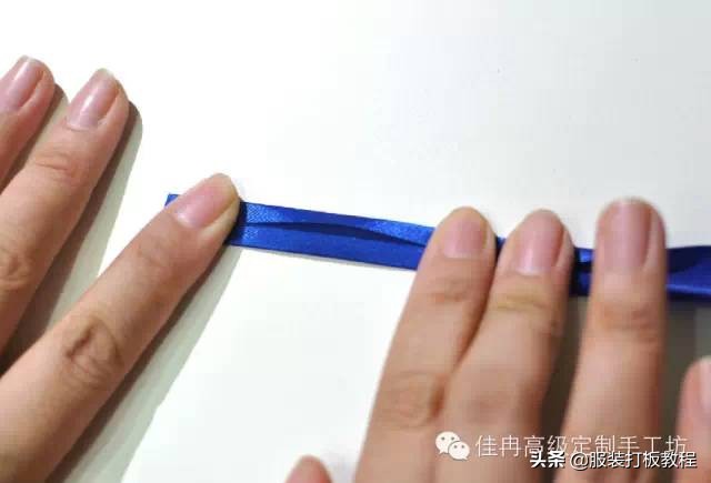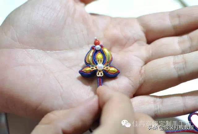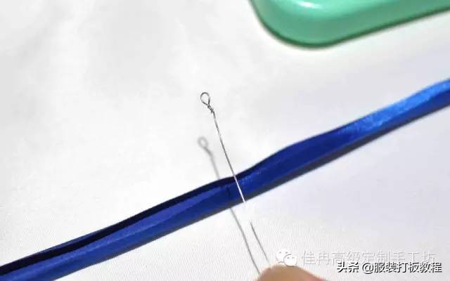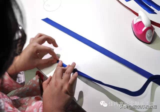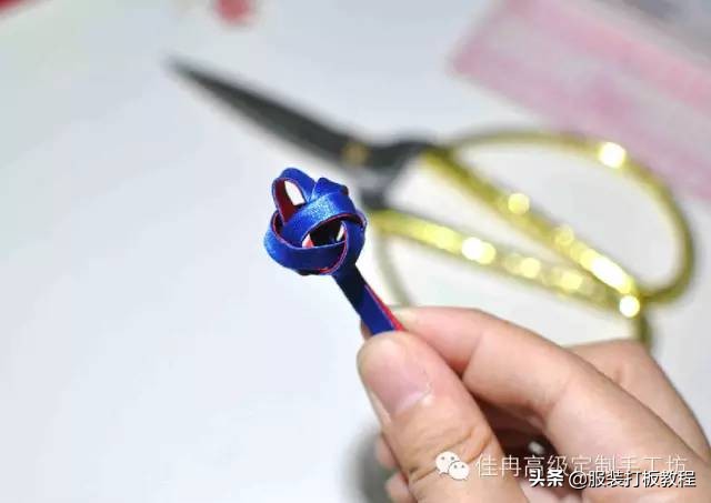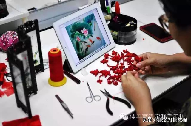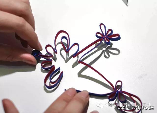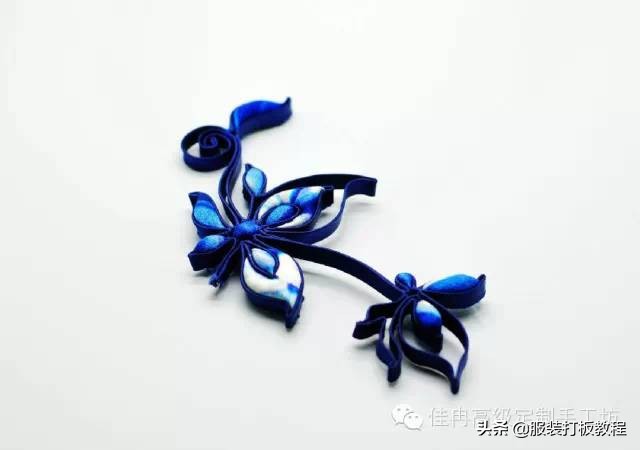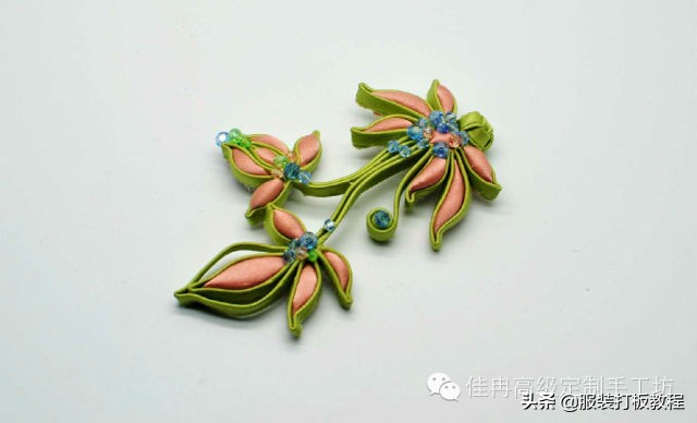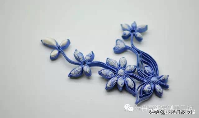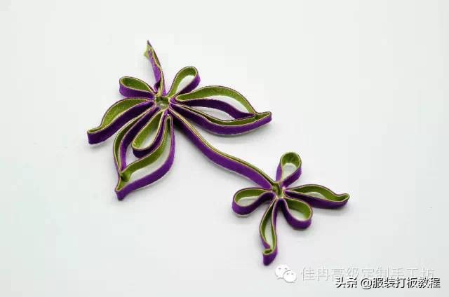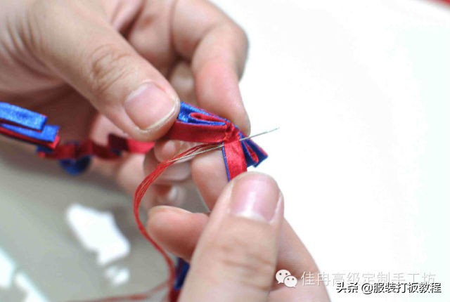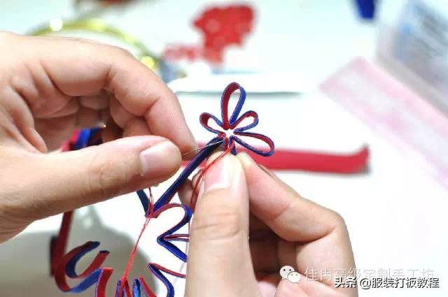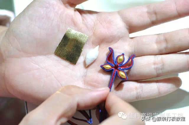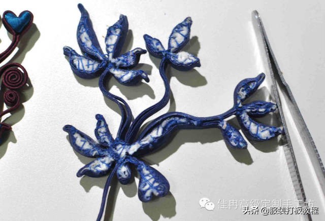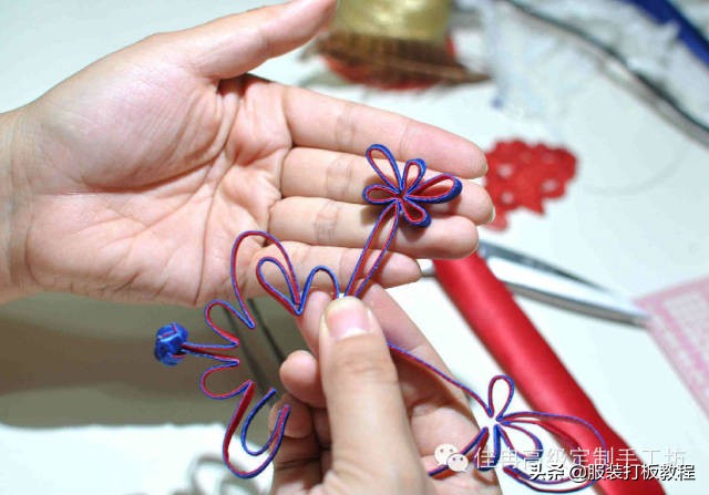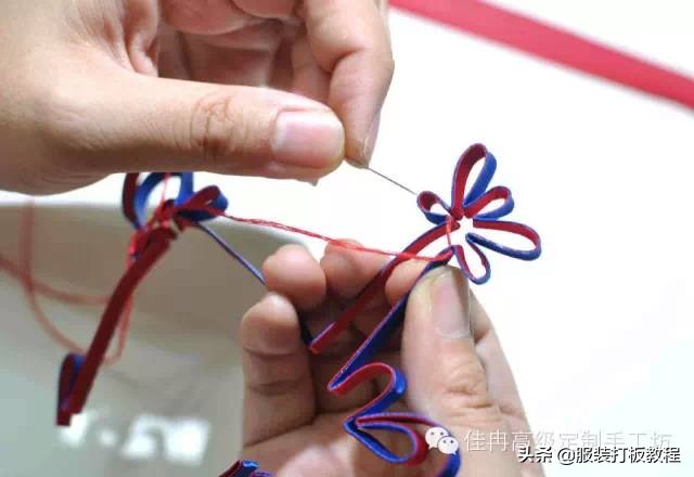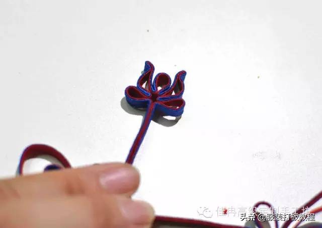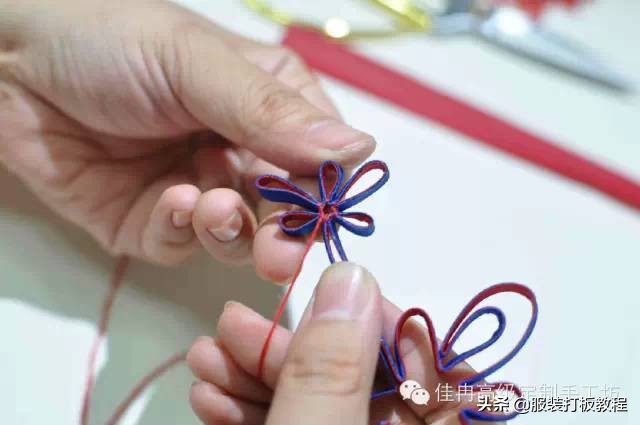 18、设计花型,一般是旗袍是大小不一的扣与袢。花型可根据服装调整设计的大小。确定好花型后,要那镊子把对折处掐紧。缝合牙子的时候用四股棉线,这样既可以勒紧一些牙子,也可以保证在勒的过程中不会断。先缝和牙子的底部,用倒针的方法去缝制,这样比较牢固,塞棉芯的时候才不容易散开。(接着缝制花扣的正面,将针线从花扣的底部插到上面,要以偷针的方式去缝制。)