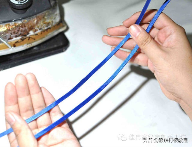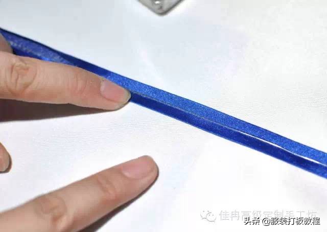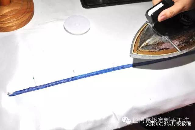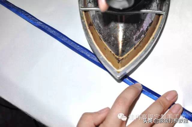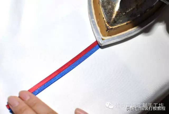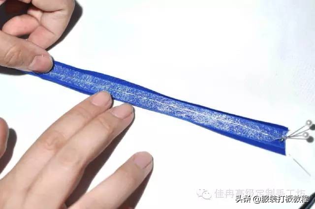 16.在牙子上面再放一层等长度的双面衬,每段用珠针固定好之后拿熨斗的蒸汽去融化双面衬,对折,之后做成0.5cm宽的牙子。反复去烫几次,使双面衬全部融化。