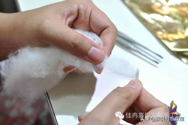 19、塞棉花芯,要把棉花团得紧实一些。剪一块小面料作为包棉花芯的面料。然后一起从盘扣的底部塞入。