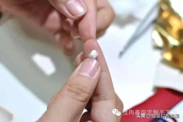 20、修剪底部多余布料,再在扣子底部烫一块有纺衬,然后缝合。在缝合的时候注意,每一针都要将衬,棉花,牙子缝在一起。可以装饰扣子表面,如钉珠,烫钻等不同装饰手法。