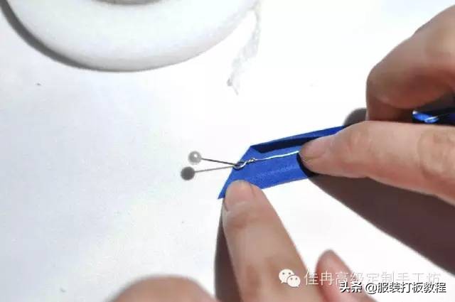 14、将铜丝扭一个小圈,用珠针将铜丝和牙子中心点一起固定在烫台上。
