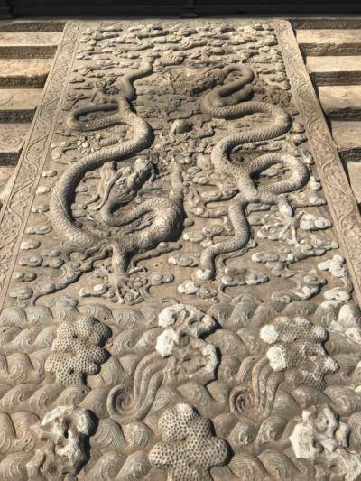 太和殿南御路上的升龙与降龙石雕,呈现“春分而登天,秋分而潜渊”的东宫苍龙形象。