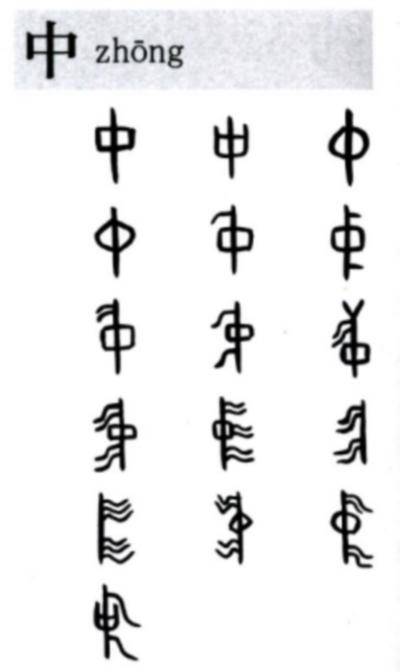 萧良琼在《卜辞中的“立中”与商代的圭表测景》一文中综合诸家解释指出,“中”字的结构是象征着一根插入地下的杆子(杆上或带斿),一端垂直在四四方方的一块地面当中。从它的空间位置来说,从上到下,垂直立着,处于地上和地下之间,所以又有从上到下的顺序里上、中、下的中的含义。同时,它又立在一块四方或圆形的地面的等距离的中心点上。