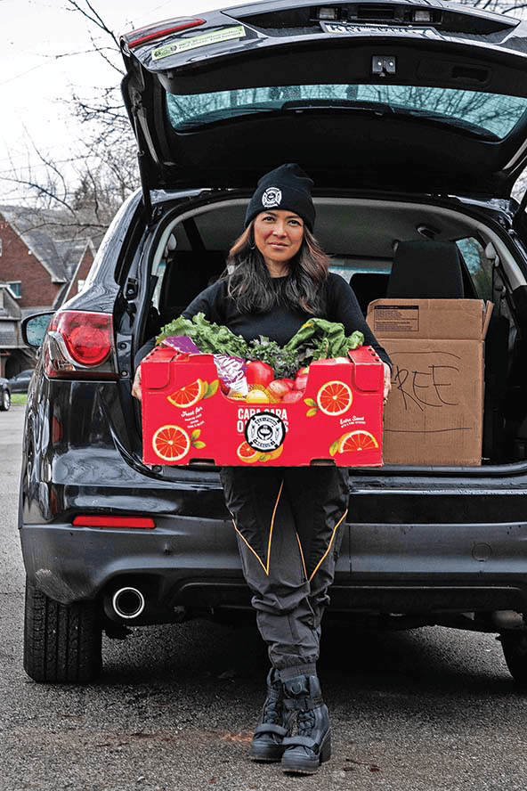 一名女子站在一辆SUV后备箱前,手里拿着一箱农产品。“食品救援英雄”(Food Rescue Hero)创始人利亚·利萨隆多(Leah Lizarondo)将剩余食物转给匹兹堡市食品得不到保障的社区(照片由Laura Petrilla提供)。