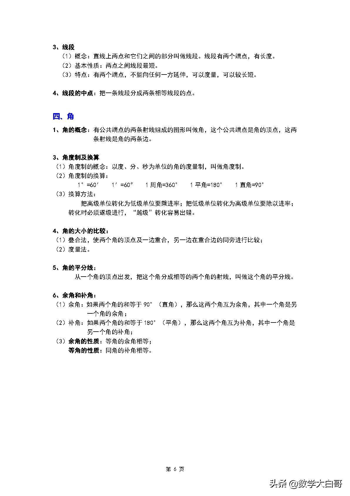 (1)余角:如果两个角的和等于90°(直角),那么这两个角互为余角,其中一个角是另