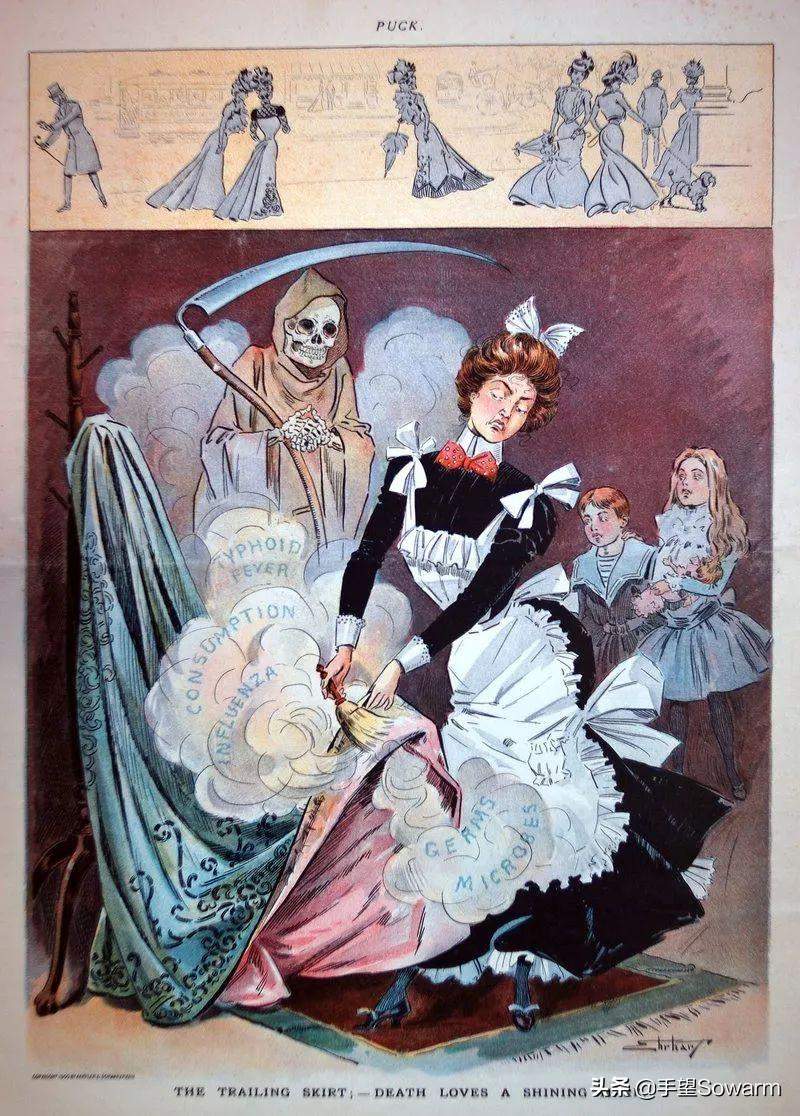 现在说起长尾巴的礼服裙,似乎会让人联想到婚礼上明亮干净的地板和婚车,但是当时礼服裙却是作为日常服装穿着。当时的街道比现在的街道可脏太多了,水泥地上都能有几口痰,更何况连下水道系统都不完善甚至完全没有的时代?