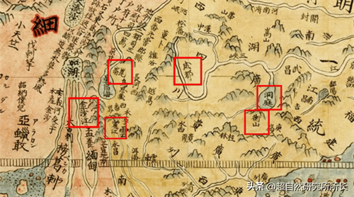 突然,窗外电闪雷鸣,利玛窦被惊醒了,原来是一场梦,于是到了第二年,利玛窦再次去北京觐见大明皇帝的时候,带去的礼物就包括这幅创作出的坤舆万国图,古地图上显示,昆仑山就在成都的西边,右边有洞庭和衡山,下面有金沙江、丽江、洱海等;
